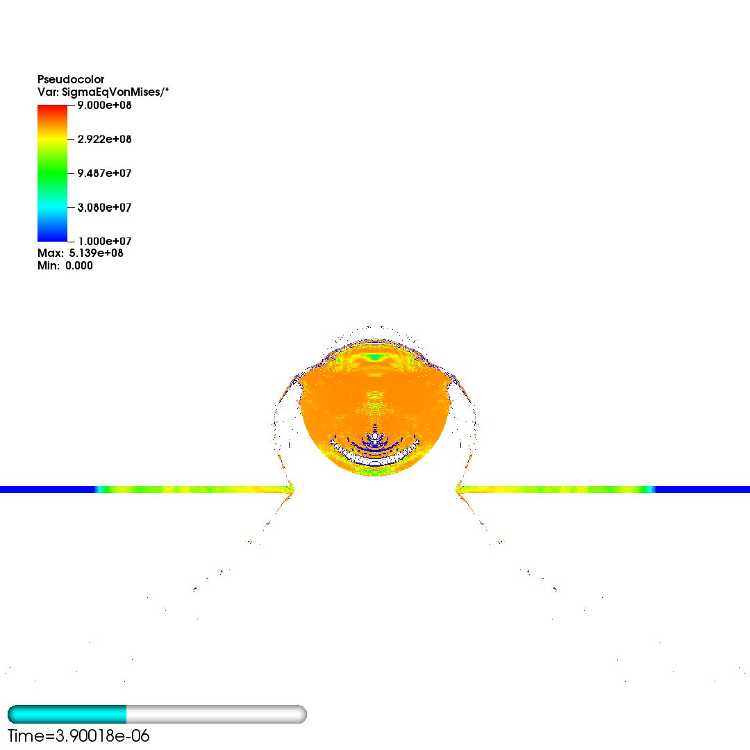 ABSTRACT: A simulation of a simple penetration experiment is performed using Material Point Method (MPM) through the Uintah Computational Framework (UCF) and interpreted using the post-processing visualization program VisIt. MPM formatting sets a background mesh with explicit boundaries and monitors the interaction of particles within that mesh to predict the varying movements and orientations of a material in response to loads. The modeled experiment compares the effects of an aluminum sphere impacting an aluminum sheet at varying velocities. In this work, the experiment called launch T-1428 (by Piekutowski and Poorman) is simulated using UCF and VisIt. The two materials in the experiment are both simulated using a hypoelastic-plastic model. Varying grid resolutions were used to verify the convergent behavior of the simulations to the experimental results. The validity of the simulation is quantified by comparing perforation hole diameter. A full 3-D simulation followed and was also compared to experimental results. Results and issues in both 2-D and 3-D simulation efforts are discussed. Both the axisymmetric and 3-D simulation results provided very good data with clear convergent behavior.