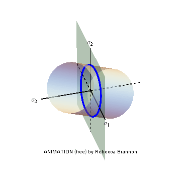 The answer is…all of the above! The von Mises cylinder is centered about the {1,1,1} direction in principal stress space. The ellipse that we learn about as undergrads applies only to plane stress (where the third principal stress is zero), and this is just the intersection of the cylinder with the plane. The circle applies to the octahedral plane, which is the view of the cylinder down its {1,1,1} axis. This animation should clarify what is going on: