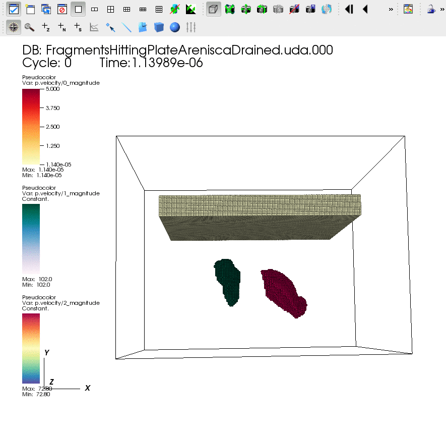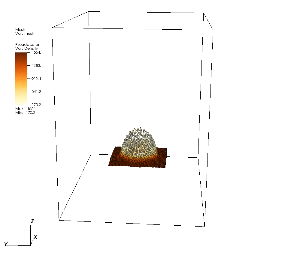 - Clods of soil impact a plate: A major advantage of the Material Point Method (developed as part of this research effort) is that it automatically allows material interaction without needing a contact algorithm.