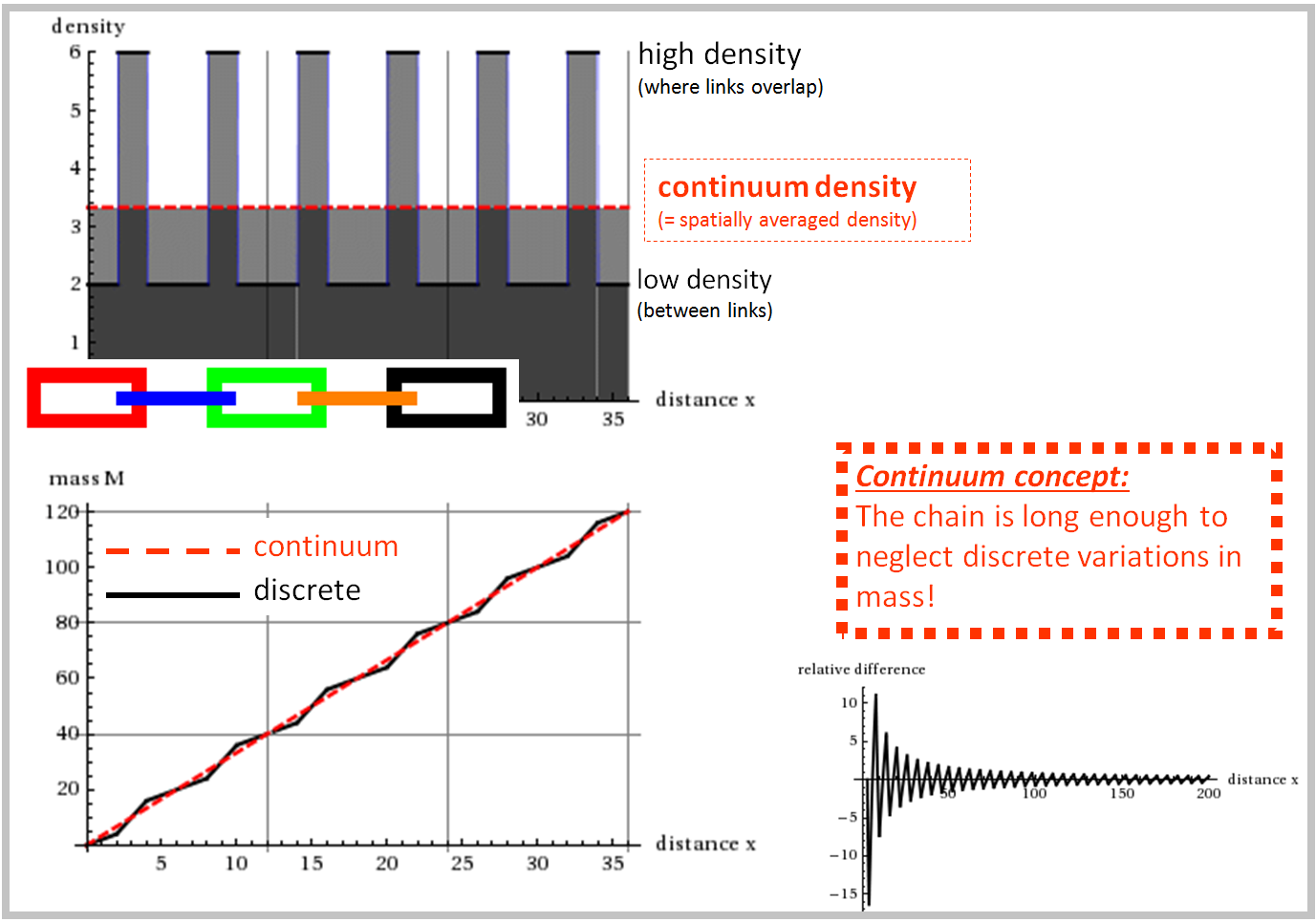 Below is shown a five-link chain (in red-blue-green-orange-black). Immediately this colorful chain is a dark-gray plot of the exact (mesocale) lineal density, which is defined at a location “x” to be the mass within an infinitesimal segment dx at that location divided by the segment’s length dx. This local density is shown as the dark-gray shaded plot in the upper-left corner, and it is the slope of the black line in the graph of the lower-left corner.